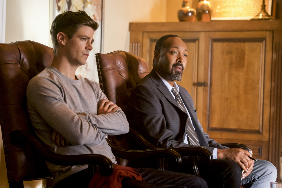 The Flash — « Therefore I Am — Image Number: FLA407b_0144b.jpg — Pictured (L-R): Grant Gustin as Barry Allen, Jesse L. Martin as Detective Joe West, Kim Engelbrecht as Marlize DeVoe and Neil Sandilands as Clifford DeVoe — Photo: Shane Harvey/The CW — é 2017 The CW Network, LLC. All rights reserved.